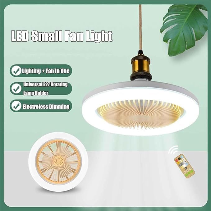 【亮度可调】LED风扇灯具有可调亮度设置,让您可以根据自己的需要调节照明水平 【180度调节】灯可以180度调节,使风角度范围更广,并可以设定或摆动风向,将空气引导到各个角度,使空气流通更好 【一键控制】有3种风速,您可以用遥控器轻松控制 【安装简单】只需在灯座(E27)上拧一个螺丝即可取代普通灯泡,无需布线。适用于客厅、卧室、儿童房、咖啡厅、书房、办公室等【内置香薰】独特的设计让您可以添加香薰片,随风将香味均匀地散发到整个房间。